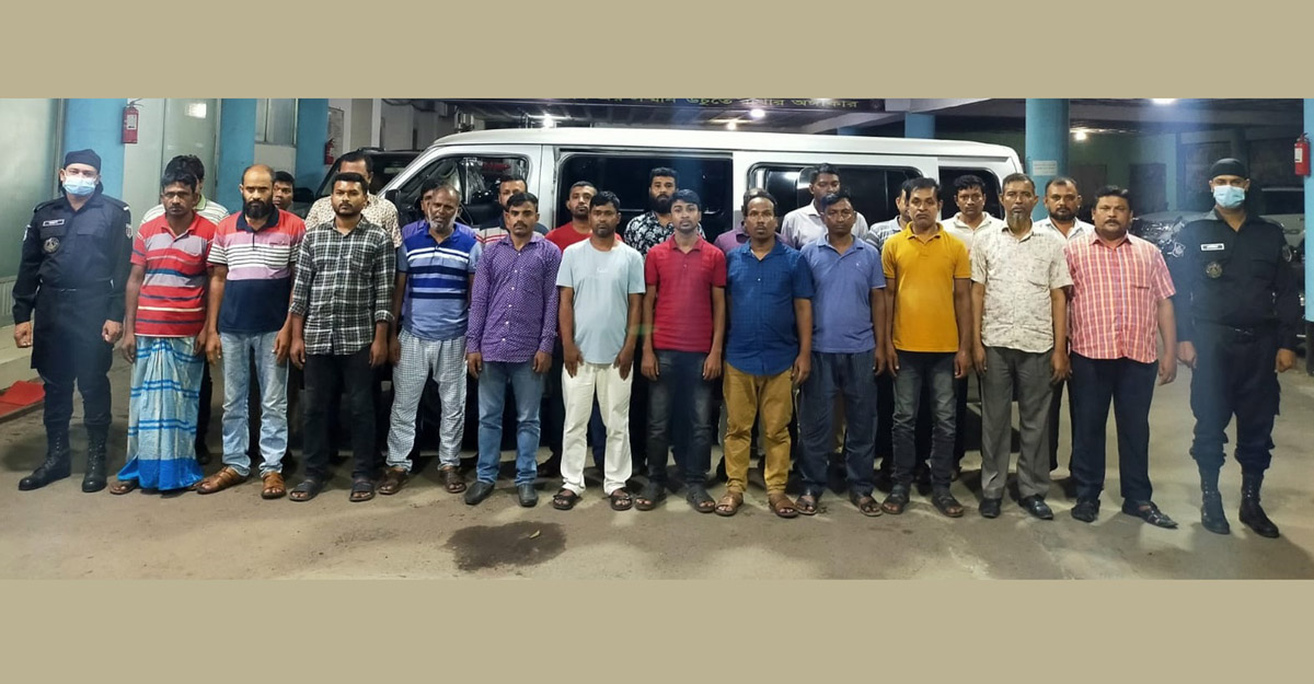 আটকরা হলেন- মাসুদুর রহমান ওরফে মিন্টু (৩৮), জাকির হোসেন (৪৭), রাজু আহম্মেদ (৩৯), মো. হানিফ (৫৫), খোরশেদ আলম (৫০), মো. মোস্তফা (৫০), আফজাল হোসেন (৪৬), আব্দুর রহমান (৪৪), আব্দুর রহমান (৪০), সাইফুল ইসলাম (৪৫), জুয়েল হোসেন (৩৭), কামাল হোসেন (২৮), মো. রাজিব (৩৩), হামিদুর রহমান (৩৩), মো. আজিজ (৩৬), হাবিবুর রহমান (৪৪), মো. মাসুদ (৩২), মো. জাহিদ (৩৫), হুমায়ুন হোসেন (৪৩), মো. মোস্তাফা (৫৫), সোহরাব হোসেন (৩৩), মো. রিপন (৩৬), মায়নুল হায়দার (৪৭) ও কামাল হোসেন (৪৮)।