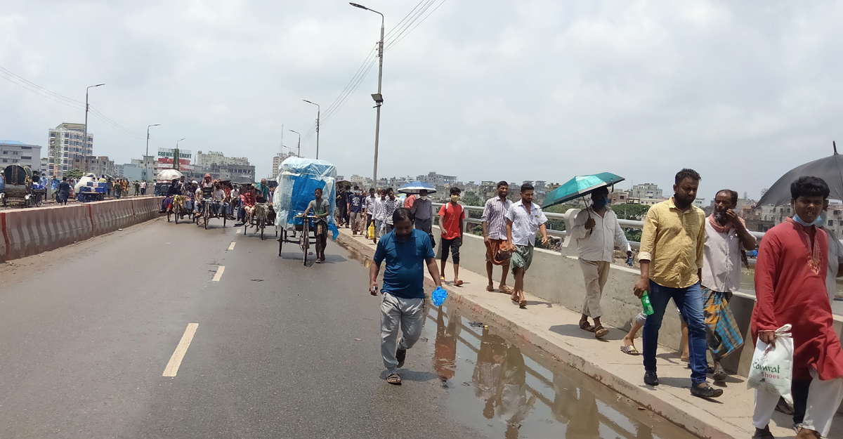 আজ শনিবার (৩১ জুলাই) দেশের দক্ষিণ অঞ্চলের প্রবেশপথ ঢাকার বাবুবাজার ব্রিজের আশপাশের এলাকায় এ চিত্র দেখা গেছে। সরেজমিনে দেখা যায়, রিকশা ও পিকআপ ভ্যানে করে মানুষ রাজধানীতে ঢুকছে। দলে দলে হেঁটেও ঢাকায় ঢুকছে মানুষ।
