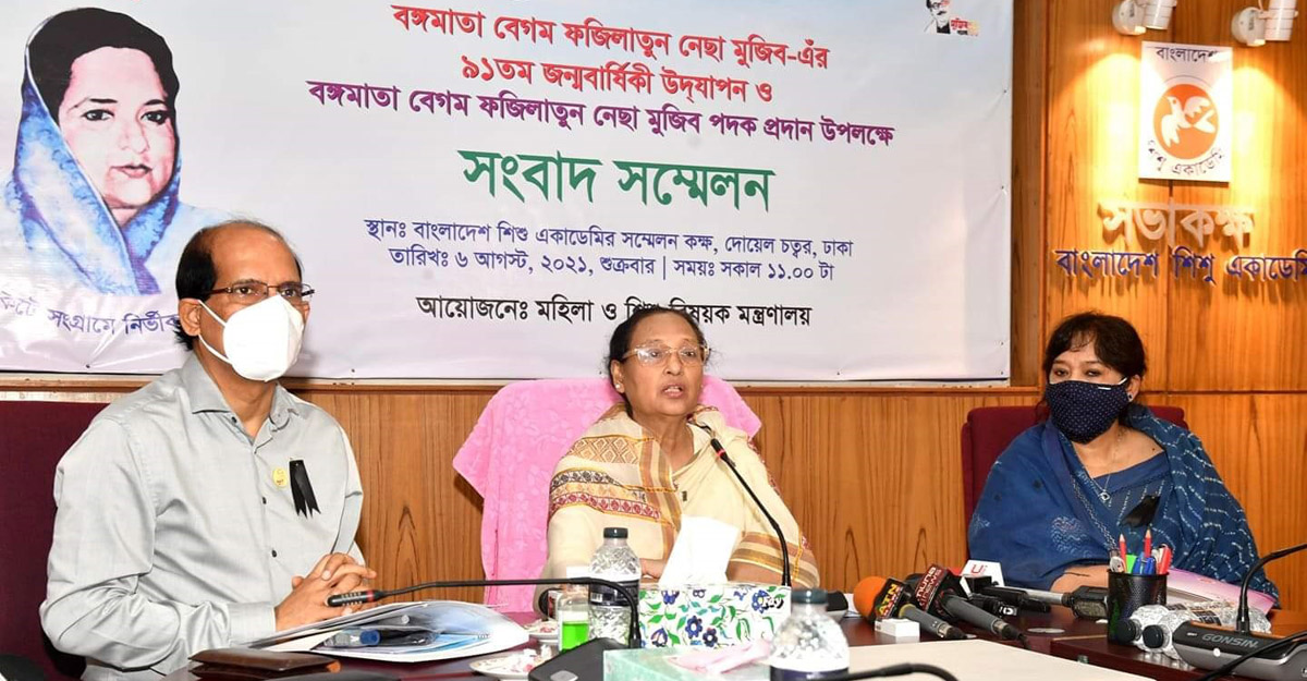 ‘বঙ্গমাতা বেগম ফজিলাতুন্নেছা মুজিব পদক’ পাচ্ছেন পাঁচ নারী। শুক্রবার (৬ আগস্ট) ঢাকায় বাংলাদেশ শিশু একাডেমির সম্মেলন কক্ষে এক সংবাদ সম্মেলনে মহিলা ও শিশুবিষয়ক প্রতিমন্ত্রী ফজিলাতুন নেসা ইন্দিরা এ তথ্য জানান।