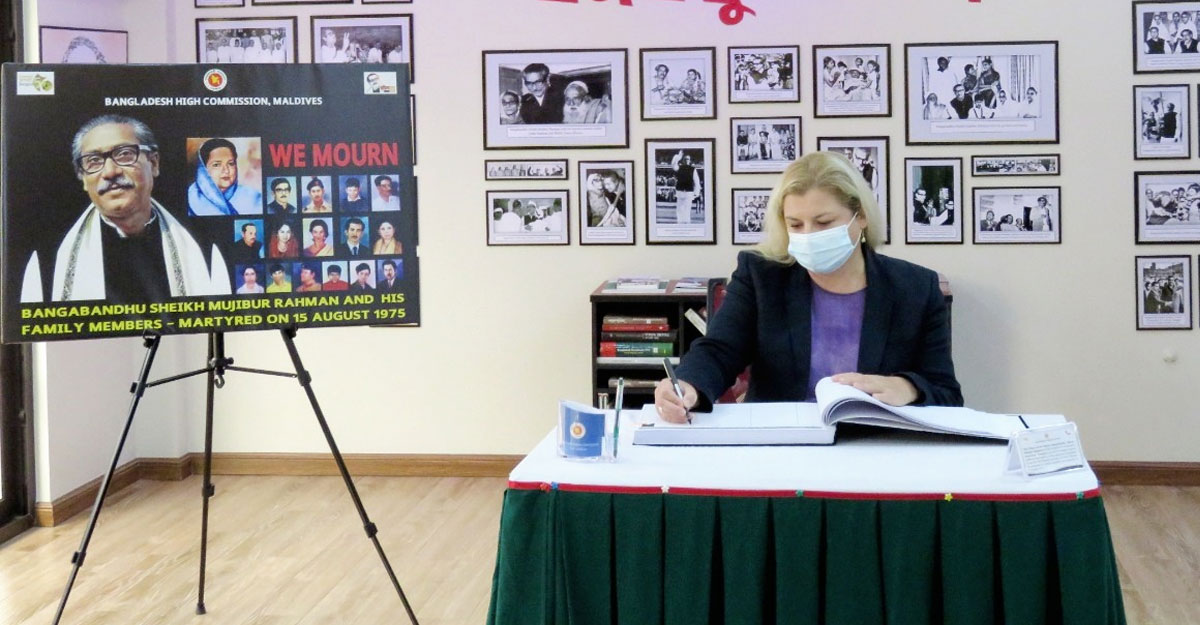 বৃহস্পতিবার (১২ আগস্ট) মালদ্বীপের বাংলাদেশ দূতাবাস জানায়, বঙ্গবন্ধুর ৪৬তম শাহাদাত বার্ষিকী উপলক্ষে ১০-১২ আগস্ট পর্যন্ত শোক বই স্বাক্ষরের জন্য উন্মুক্ত ছিল। এ সময়ে মালদ্বীপের পররাষ্ট্র প্রতিমন্ত্রী, পররাষ্ট্র সচিবসহ পররাষ্ট্র মন্ত্রণালয়ের ঊর্ধ্বতন কর্মকর্তারা হাইকমিশনে উপস্থিত হয়ে শোক বই স্বাক্ষর করেন।