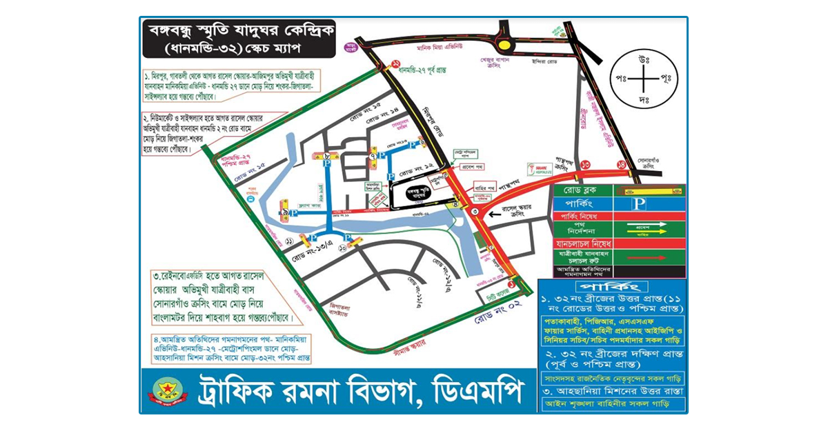১৪ আগস্ট ঢাকা মেট্রোপলিটন পুলিশ কমিশনার মোহা. শফিকুল ইসলামের এক প্রেস বিজ্ঞপ্তিতে জানানো হয়, জাতীয় শোক দিবসের অনুষ্ঠানে আগত অতিথিদের যানবাহন সুষ্ঠুভাবে চলাচল ও যানজট পরিহারের লক্ষ্যে ধানমন্ডি–৩২, বঙ্গবন্ধু স্মৃতি যাদুঘর এলাকায় চলাচলরত গাড়ি চালক/ব্যবহারকারীদের জন্য ১৫ আগস্ট ভোর থেকে অনুষ্ঠান শেষ না হওয়া পর্যন্ত নতুন ট্রাফিক নির্দেশনা জারি করেছে ঢাকা মেট্রোপলিটন পুলিশের ট্রাফিক বিভাগ।