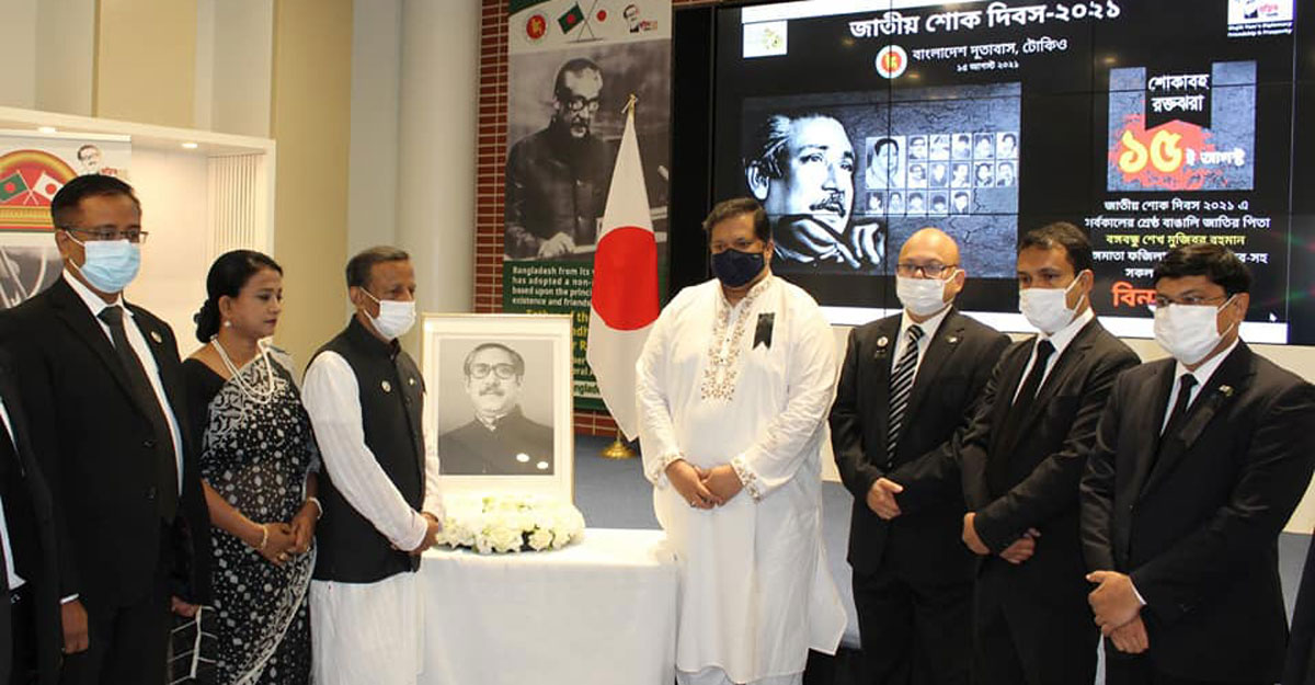 রোববার (১৫ আগস্ট) টোকিও বাংলাদেশ দূতাবাস জানায়, সকালে দূতাবাস প্রাঙ্গণে জাতীয় পতাকা অর্ধনমিত করার মাধ্যমে শোক দিবসের আনুষ্ঠানিকতা শুরু হয়। জাতীয় সঙ্গীত পরিবেশনের সঙ্গে জাতীয় পতাকা অর্ধনমিত করেন জাপানে নিযুক্ত বাংলাদেশের রাষ্ট্রদূত শাহাবুদ্দিন আহমদ। এ সময় প্রধান অতিথি হিসেবে উপস্থিত ছিলেন যুব ও ক্রীড়া প্রতিমন্ত্রী জাহিদ আহসান রাসেল।