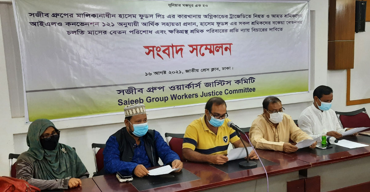 জাস্টিস কমিটির এ সদস্য বলেন, নারায়ণগঞ্জ জেলা প্রশাসনের গঠিত তদন্ত কমিটির প্রতিবেদনে সজীব গ্রুপের অনিয়মসহ ভবিষ্যতে অগ্নিকাণ্ডরোধে যে ২০টি সুপারিশ দিয়েছে সেগুলোকে আমরা গঠনমূলক মনে করি। তবে নিহত ও আহত তথা ক্ষতিগ্রস্ত শ্রমিক ও তাদের পরিবারকে আইএলও কনভেনশন ১২১ অনুযায়ী ক্ষতিপূরণের পরিমাণ নির্ধারণ করে তাদের ক্ষতিপূরণ দেওয়ার দাবি জানাই। ক্ষতিগ্রস্ত শ্রমিক ও তাদের পরিবারকে যথাযথ আর্থিক সহায়তা দেওয়ার পাশাপাশি হাসেম ফুডস এ কর্মরত সব শ্রমিকে বকেয়া বেতন, বকেয়া ওভারটাইমসহ তাদের প্রতি মাসের বেতন পরিশোধ করার দাবি জানাই।