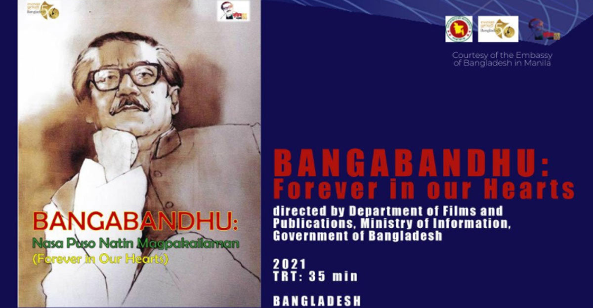 দূতাবাস জানায়, কালচারাল সেন্টার অফ ফিলিপাইন ও ফিলিপাইনের সিনেমালয় ফাউন্ডেশনের যৌথভাবে আয়োজিত ১৭তম সিনেমালয় ফিলিপাইন চলচ্চিত্র উৎসবে আগামী ২২-২৪ আগস্ট বঙ্গবন্ধু শেখ মুজিবুর রহমানের ওপর নির্মিত একটি প্রামাণ্যচিত্র প্রদর্শিত হবে। বাংলাদেশের চলচ্চিত্র ও প্রকাশনা অধিদফতর কর্তৃক নির্মিত প্রামাণ্যচিত্রটির নাম ‘বঙ্গবন্ধু : ফরএভার ইন আওয়ার হার্টস’।
