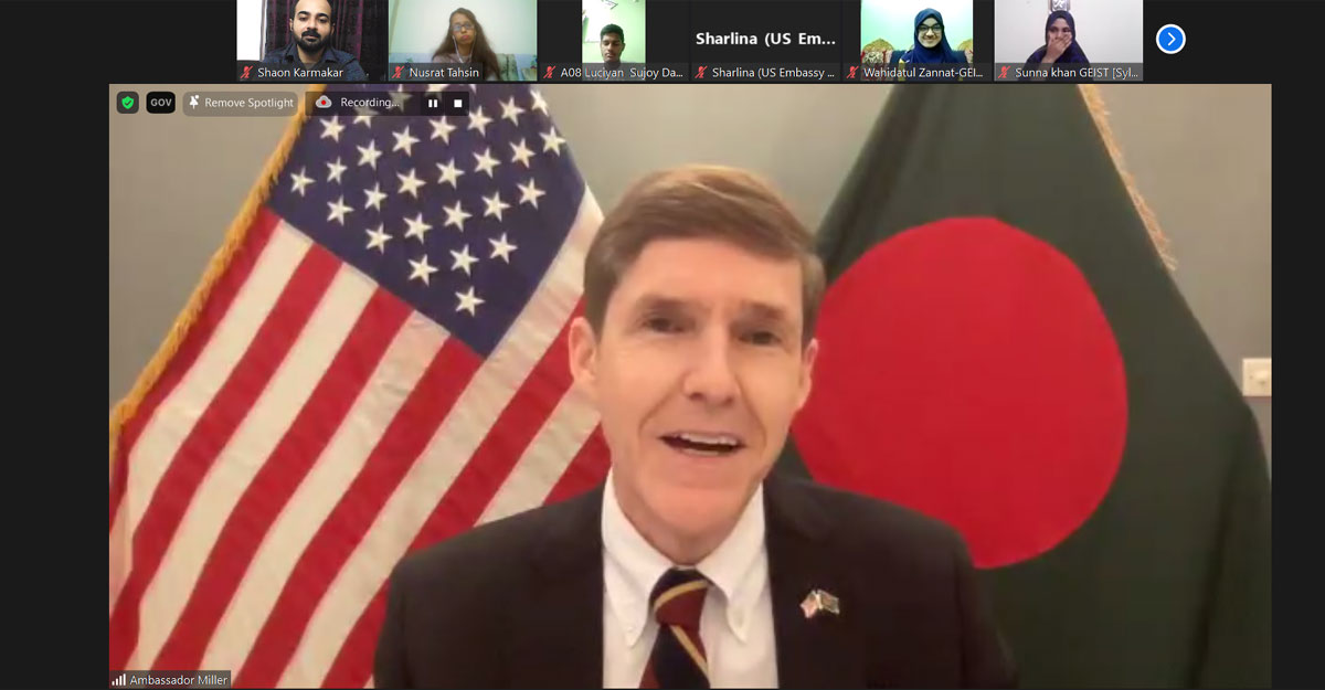 দূতাবাস জানায়, মঙ্গলবার সন্ধ্যায় রাষ্ট্রদূত আর্ল মিলার আমেরিকার পররাষ্ট্র দফতরের (স্টেট ডিপার্টমেন্ট) অর্থায়নে পরিচালিত ইংলিশ অ্যাক্সেস মাইক্রোস্কলারশিপ প্রোগ্রামের নতুন কোর্সের জন্য নির্বাচিত হওয়া ২০০ জন বাংলাদেশি শিক্ষার্থীকে অভিনন্দন জানিয়েছেন। রাষ্ট্রদূত জীবন বদলে দেওয়ার এ কর্মসূচিতে অংশগ্রহণের জন্য ঢাকা, সিলেট ও চট্টগ্রামের স্থানীয় মাদরাসা, সরকারি ও কারিগরি স্কুলের ১০০ জন তরুণী ও ১০০ জন তরুণ শিক্ষার্থীর প্রশংসা করেন।
