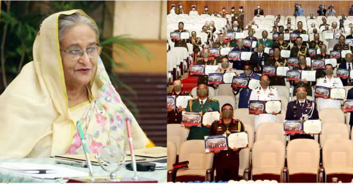 রোববার (১৩ ডিসেম্বর) ন্যাশনাল ডিফেন্স কোর্স-২০২০ ও আর্মড ফোর্সেস ওয়ার কোর্স-২০২০ এর সমাপনী অনুষ্ঠানে প্রধান অতিথি হিসেবে (অনলাইন) উপস্থিত থেকে এসব সনদ তুলে দেন প্রধানমন্ত্রী।