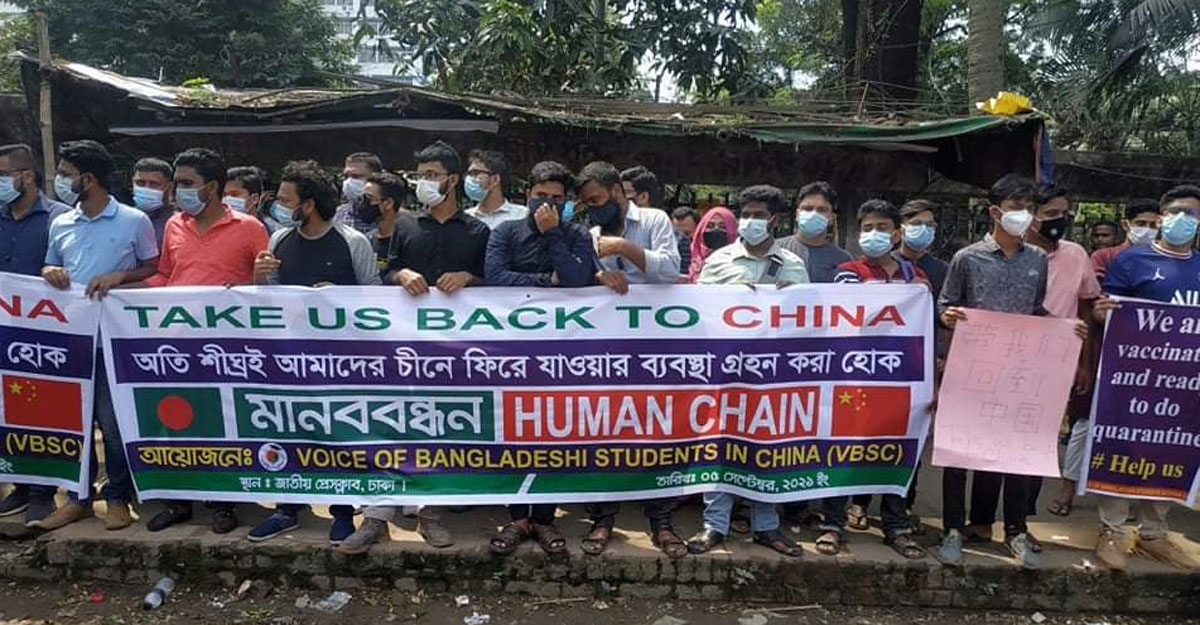 মানববন্ধনে অংশ নেওয়া শিক্ষার্থীরা বলেন, ২০১৯ সালের নভেম্বর-ডিসেম্বরে চীনে করোনা ভাইরাস মহামারি আকার ধারণ করলে প্রায় ৬ হাজারের মতো শিক্ষার্থী বাংলাদেশে ফিরে আসে। দেশে ফিরে দেড় বছরের বেশি সময় ধরে আমরা অনলাইন পাঠ্যক্রমের আওতায় আছি। কিন্তু অনলাইন পাঠদান শেখার জন্য পর্যাপ্ত না হওয়ায় আমরা পড়ালেখায় অনেক পিছিয়ে পড়েছি, এমতাবস্থায় যদি পরবর্তী সেমিস্টারেও চীনে যেতে না পারি, তাহলে আমাদের পড়াশোনা ও ক্যারিয়ার হুমকির মধ্যে পড়বে। এই বড় সংখ্যক শিক্ষার্থী এবং তাদের পরিবার সংকটে পড়বে। কিন্তু অত্যন্ত দুঃখের সাথে বলতে হচ্ছে, গত প্রায় দুই বছর কেটে গেলেও আজ পর্যন্ত আমাদের ফিরে যাওয়া হয়নি। আমাদের ফিরে যাওয়ার জন্য কোনো পদক্ষেপও নেওয়া হয়নি।