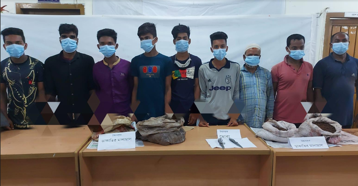 গ্রেফতাররা হলেন, মো. রকি (২২) মো. রাসেল আখন (২৭), মো. আব্দুল্লাহ (২০), মো. রানা পারভেজ (১৯), মো. ইব্রাহিম শান্ত (২০), মো. আব্দুর রায়হান (১৯), মোহাম্মদ আলী রমজান (২০), মো. আব্দুল জলিল (৬২), মো. মজিবুর রহমান রিপন (৩০) ও মো. সাজ্জাদ (৩০)।