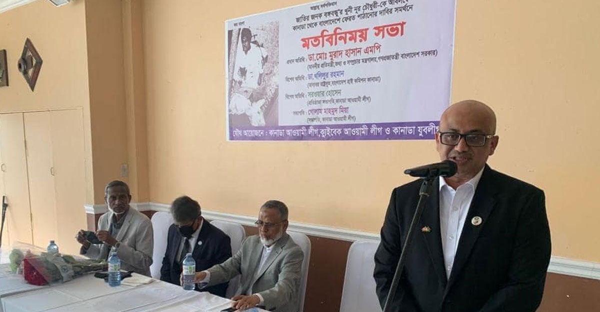 কানাডার স্থানীয় সময় শনিবার (২৫ সেপ্টেম্বর) সন্ধ্যায় কানাডা আওয়ামী লীগ, কুইবেক আওয়ামী লীগ ও কানাডা যুবলীগের যৌথ উদ্যোগে আয়োজিত জাতির পিতা ‘বঙ্গবন্ধুর খুনি নূর চৌধুরীকে অবিলম্বে বাংলাদেশে ফেরত পাঠানোর দাবির সমর্থনে মতবিনিময়’ সভায় প্রধান অতিথির বক্তব্যে প্রতিমন্ত্রী এ কথা বলেন।