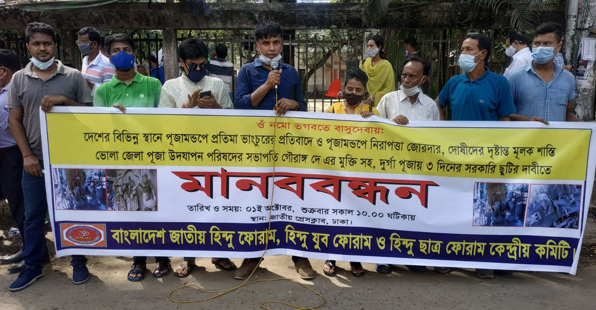 আজ (শুক্রবার) জাতীয় প্রেস ক্লাবের সামনে বাংলাদেশ জাতীয় হিন্দু ফোরাম, হিন্দু যুব ফোরাম ও হিন্দু ছাত্র ফোরাম আয়োজিত এক মানববন্ধন থেকে এসব দাবি জানানো হয়।