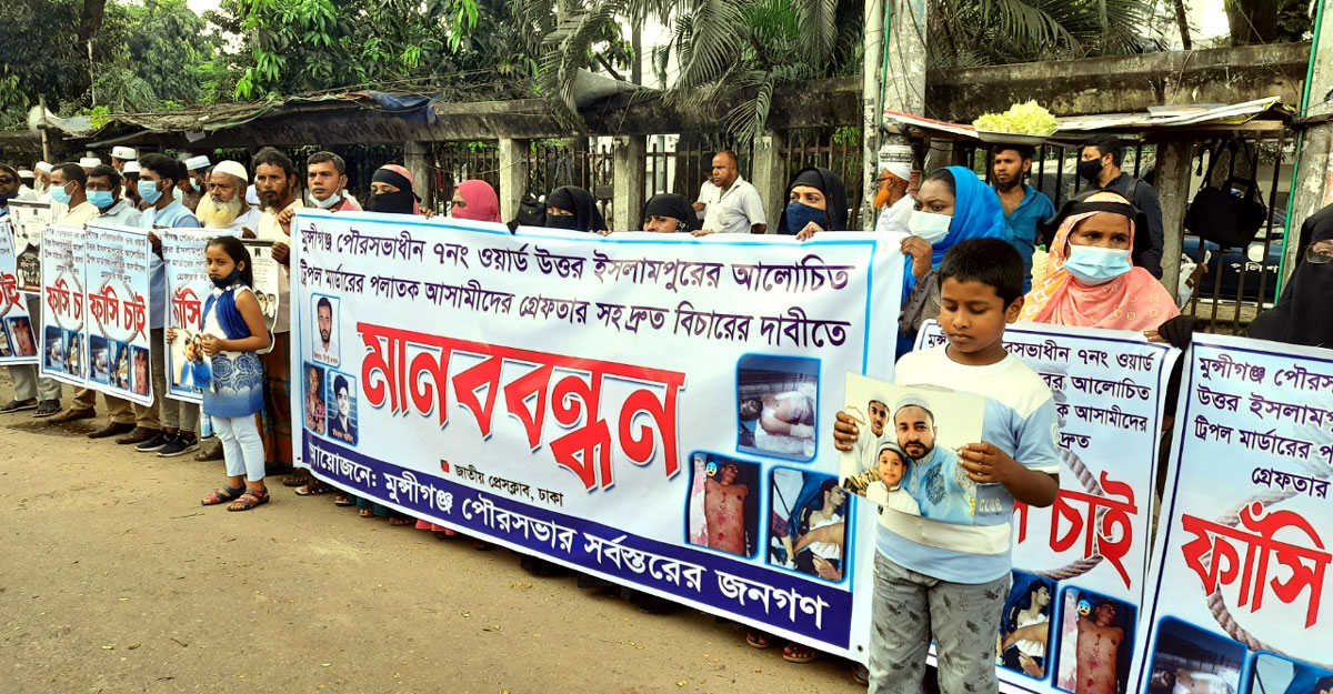 মানববন্ধনে অ্যাড. কাজী মোজাম্মেল হোসেন রোমেল বলেন, চাঞ্চল্যকর এই মামলাটি যেন দ্রুত বিচার ট্রাইবুনালে আসে সে জন্য আমরা মুন্সিগঞ্জে মানববন্ধন করেছিলাম। কিন্তু পরিতাপের বিষয় সেখান থেকে সভ্যতার আলো ছাড়া আর কোনো গণমাধ্যম আমাদের বিষয়টি দেখা যায়নি। এটার একটাই কারণ, দুষ্কৃতকারীরা জানে এটি যদি প্রধানমন্ত্রী শেখ হাসিনার কানে যায় তাহলে অবশ্যই এটার বিচার হবে।
