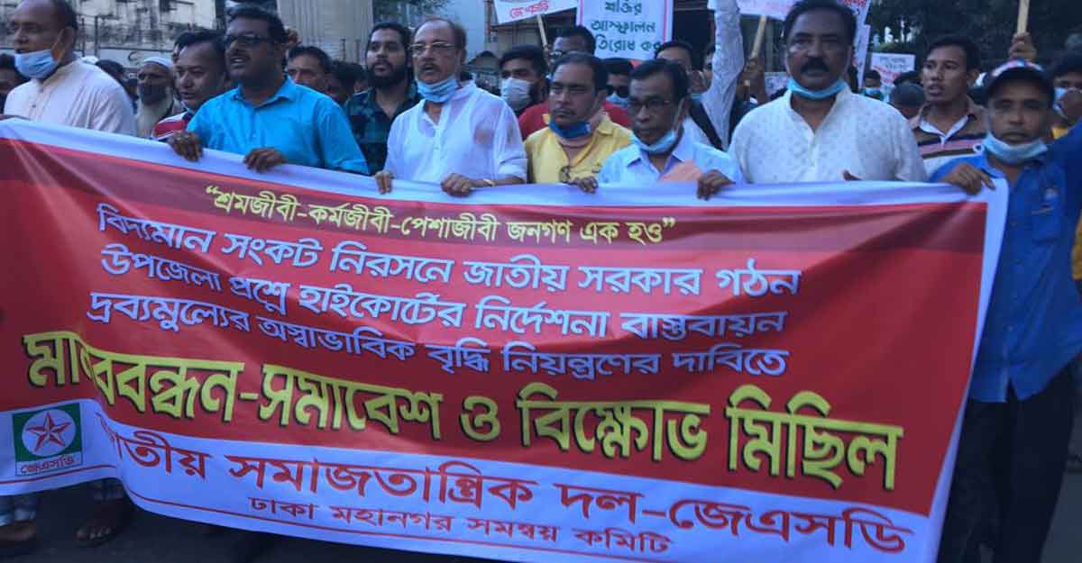 জেএসডি ঢাকা মহানগর কমিটির সমন্বয়ক কামাল উদ্দিন পাটোয়ারীর সভাপতিত্বে বিক্ষোভ মিছিল পূর্ব মানববন্ধন সমাবেশে আরো উপস্থিত ছিলেন সা কা ম আনিসুর রহমান খান কামাল, তানিয়া রব, অ্যাড. কে এম জাবির, অ্যাড. সৈয়দ বেলায়েত হোসেন বেলাল, শ্রমিক নেতা মোশাররফ হোসেন, যুব নেতা এস এম সামছুল আলম নিক্সন, মোসাররফ হোসেন, শফিকুল ইসলাম শফিক, ছাত্রনেতা তৌফিকুজ্জামান পীরাচা প্রমুখ।