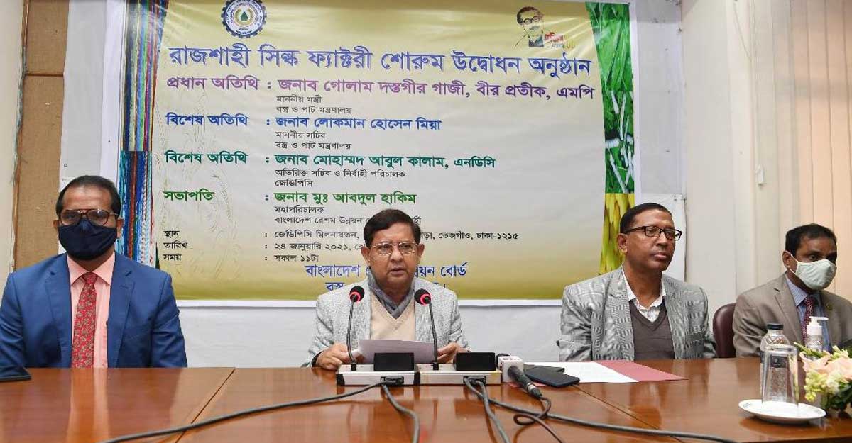রোববার (২৪ জানুয়ারি) দুপুরে পাট প্রোমোশন বিবিধকরণ সেন্টার (জেডিপিসি) মিলনায়তনে আয়োজিত এক অনুষ্ঠানে তিনি এ তথ্য জানান। এ অনুষ্ঠানের মাধ্যমে রাজশাহীর ঐতিহ্যবাহী রেশম পণ্যের প্রদর্শনী ও বিক্রয় কেন্দ্রের উদ্বোধন করা হয়।
