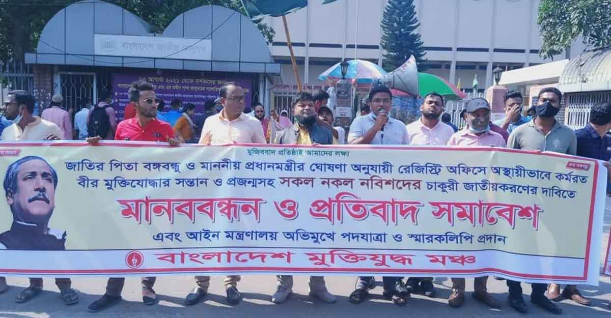 রেজিস্ট্রি অফিসে অস্থায়ীভাবে কর্মরত দেশের সব নকলনবিশদের চাকরি জাতীয়করণের দাবিতে মানববন্ধন ও প্রতিবাদ সমাবেশ করেছে বাংলাদেশ মুক্তিযুদ্ধ মঞ্চ।