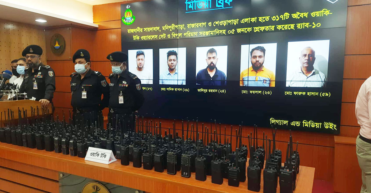 রাজধানীর সায়েদাবাদ, মনিপুরীপাড়া, রাজারবাগ ও শেওড়াপাড়া এলাকা থেকে ৩১৭টি ওয়াকিটকি এবং সংশ্লিষ্ট বিপুল পরিমাণ সরঞ্জামাদিসহ পাঁচজনকে গ্রেফতারের পর এ তথ্য দিয়েছে পুলিশের এলিট ফোর্স র্যাপিড অ্যাকশন ব্যাটালিয়ন (র্যাব)।