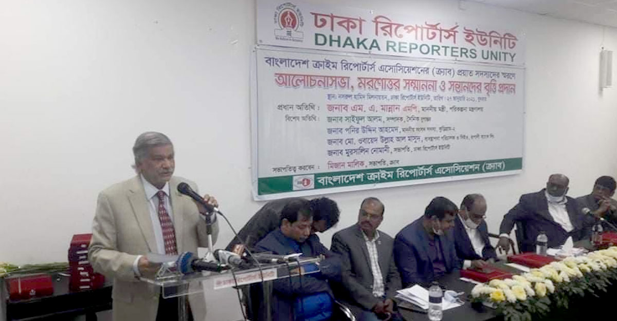ঝুঁকি ভাতা ও পেনশনসহ সাংবাদিকদের সুযোগ-সুবিধা আরও বাড়ানো হবে বলে জানিয়েছেন পরিকল্পনা মন্ত্রী এম এ মান্নান। বুধবার (২৭ জানুয়ারি) ঢাকা রিপোর্টাস ইউনিটির নসরুল হামিদ মিলনায়তনে ক্রাইম রিপোর্টাস অ্যাসোসিয়েশন (ক্র্যাব) আয়োজিত সংগঠনটির প্রয়াত সদস্যদের স্মরণে আলোচনা সভা, মরণোত্তর সম্মাননা ও সন্তানদের বৃত্তি প্রদান অনুষ্ঠানে তিনি এ কথা বলেন।