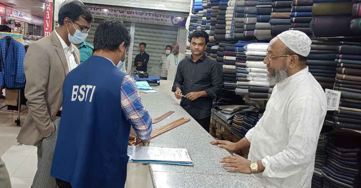 বৈধ ভেরিফিকেশন সনদ ছাড়া মিটার স্কেল ব্যবহার এবং কাপড় পরিমাপে ননমেট্রিক পদ্ধতি ব্যবহার করার অপরাধে দুই প্রতিষ্ঠানের বিরুদ্ধে মামলা ও জরিমানা করেছে বাংলাদেশ স্ট্যান্ডার্ডস অ্যান্ড টেস্টিং ইনস্টিটিউশন (বিএসটিআই)।