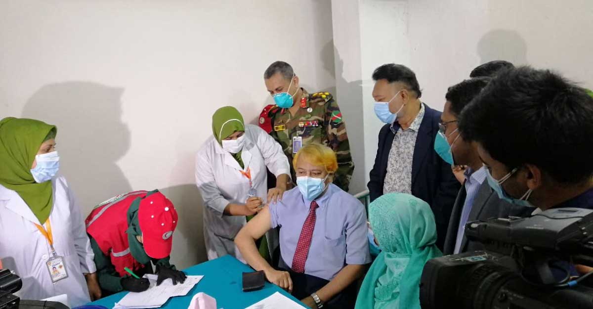 টিকা নিচ্ছেন ঢামেক হাসপাতালের নাক কান গলা বিভাগের প্রধান অধ্যাপক ডা. শেখ নুরুল ফাত্তাহ রুমি