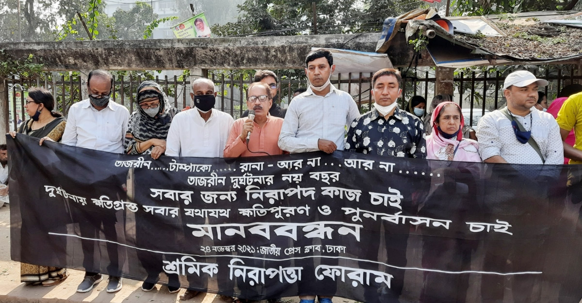 মানববন্ধনে বক্তারা বলেন, ২০১২ সালের ২৪ নভেম্বর তাজরীন গার্মেন্টসের ভয়াবহ অগ্নিকাণ্ডের নয় বছর আজ। সেদিনের আগুন কেড়ে নিয়েছিল ১১৩ শ্রমিকের প্রাণ। তাজরীনের পর রানা প্লাজা ভবন ধসে ১ হাজার ১৩৪ জনের প্রাণহানি। কে.টি. এস, স্পেকট্রাম, তাজরীন, হামীম, স্মার্ট, রানা প্লাজা, আসওয়াদ, টাম্পাকো, হাসেম ফুডসসহ সব প্রতিষ্ঠানেই শ্রমিকের মৃত্যুর মিছিল চলছেই। গত ১০ বছরে গার্মেন্টস শিল্পে বিভিন্ন দুর্ঘটনায় প্রাণ হারিয়েছেন হাজারেরও বেশি শ্রমিক।