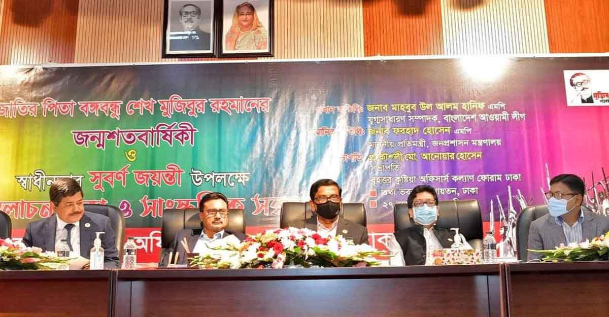 শনিবার (২৭ নভেম্বর) ঢাকায় তথ্য ভবন মিলনায়তনে জাতির পিতা বঙ্গবন্ধু শেখ মুজিবুর রহমানের জন্মশতবার্ষিকী ও মহান স্বাধীনতার সুবর্ণজয়ন্তী উদযাপন উপলক্ষে এক আলোচনা সভা ও সাংস্কৃতিক অনুষ্ঠানে তিনি এ কথা বলেন।