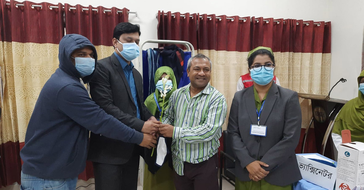 করোনার টিকা নিয়ে খুশি হাসপাতালের সবাই। ফুল জানাচ্ছেন সহকর্মীরাই