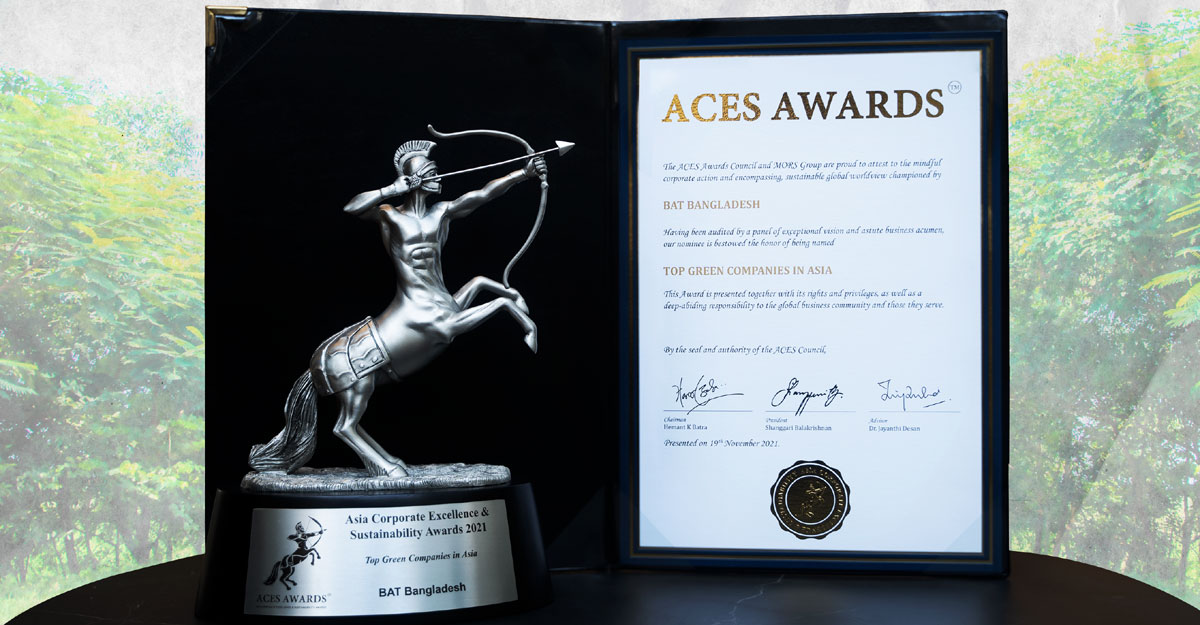 এশিয়ার অন্যতম সবুজ কোম্পানি ক্যাটাগরিতে এশিয়া কর্পোরেট এক্সিলেন্স অ্যান্ড সাস্টেইন্যাবিলিটি (এসিইএস) অ্যাওয়ার্ডস জিতেছে বিএটি বাংলাদেশ। এনভায়রনমেন্টাল, সোশ্যাল ও গভর্ন্যান্স (ইএসজি) চর্চায় বর্ণাঢ্য অবদানের জন্য দেশের প্রথম কোম্পানি হিসেবে এ পুরস্কারে স্বীকৃত হয়েছে প্রতিষ্ঠানটি।