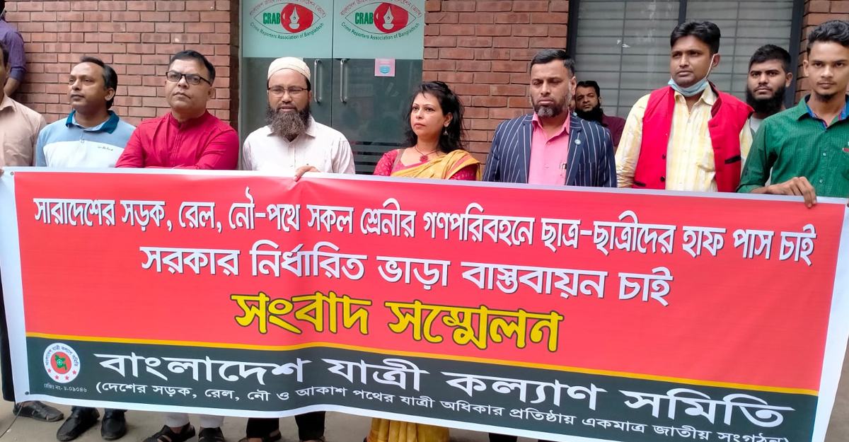 সড়ক, রেল ও নৌপথে সব শ্রেণীর গণপরিবহনে শিক্ষার্থীদের হাফ ভাড়া কার্যকরসহ ২০টি সুপারিশ করেছে বাংলাদেশ যাত্রী কল্যাণ সমিতি। শনিবার সকালে ঢাকা রিপোর্টার্স ইউনিটির সামনে আয়োজিত এক সংবাদ সম্মেলন থেকে এসব সুপারিশ তুলে ধরেন সমিতির মহাসচিব মো. মোজাম্মেল হক চৌধুরী।