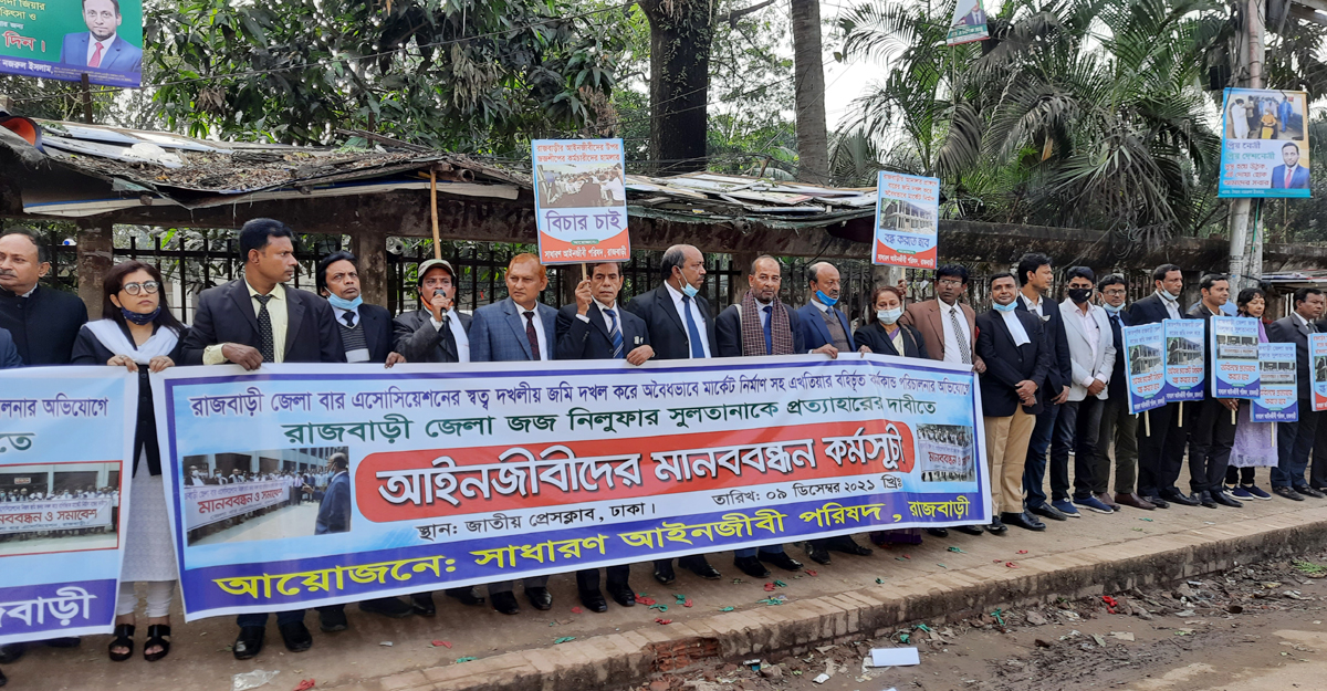 রাজবাড়ী জেলা বার অ্যাসোসিয়েশনের স্বত্ব দখলীয় জমিতে অবৈধভাবে মার্কেট নির্মাণ ও জজ আদালতের কর্মচারী কর্তৃক আইনজীবীদের ওপর হামলার ঘটনায় সুষ্ঠু বিচারের দাবি জানিয়ে ঢাকায় মানববন্ধন করেছে রাজবাড়ীর সাধারণ আইনজীবী পরিষদ।