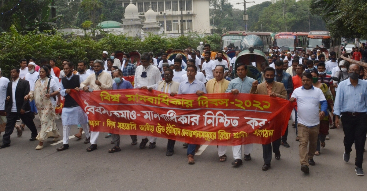 শুক্রবার (১০ ডিসেম্বর) আন্তর্জাতিক মানবাধিকার দিবস ২০২১ উপলক্ষে রিকশা শ্রমিক সংগঠনগুলোকে নিয়ে র্যালির আয়োজন করা হয়। র্যালিটি রাজধানীর শাহবাগ জাতীয় জাদুঘরের সামনে থেকে শুরু হয়ে মৎস্য ভবন হয়ে কদম ফোয়ারায় গিয়ে শেষ হয়। র্যালিটি আয়োজনে সহযোগিতা করে বাংলাদেশ ইনস্টিটিউট অব লেবার স্টাডিজ (বিলস্)।