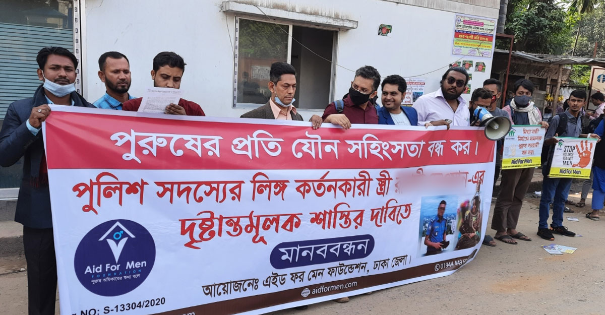 মানববন্ধনে এইড ফর মেনের সভাপতি আব্দুর রাজ্জাক খান বলেন, গত ৯ ডিসেম্বর রাজশাহীর মালোপাড়ায় একজন এসআইয়ের পুরুষাঙ্গ কেটেছেন তার স্ত্রী। ওই এসআই এখন হাসপাতালে চিকিৎসাধীন। পারিবারিক কলহের জের ধরে ওই এসআইয়ের স্ত্রী ধারালো অস্ত্র দিয়ে তার পুরুষাঙ্গ কেটে দেন। পরে স্থানীয়রা তাকে উদ্ধার করে রাজশাহী মেডিকেল কলেজ হাসপাতালের জরুরি বিভাগে ভর্তি করান। সেখান থেকে তাকে নেওয়া হয় হাসপাতালের ২ নম্বর ওয়ার্ডে। অবস্থার অবনতি হলে নেওয়া হয় অপারেশন থিয়েটারে।