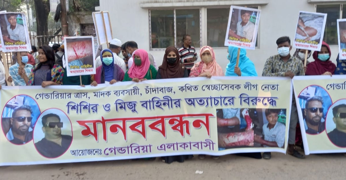 রাজধানীর গেন্ডারিয়ার আলি হাসান শিশির ও মশিউর রহমান মিজু নামে দুই ব্যক্তির বিরুদ্ধে মাদক ব্যবসা, চাঁদাবাজির অভিযোগ তুলে তাদের অত্যাচার থেকে রক্ষায় প্রধানমন্ত্রী শেখ হাসিনার হস্তক্ষেপ কামনা করে মানববন্ধন করা হয়েছে।