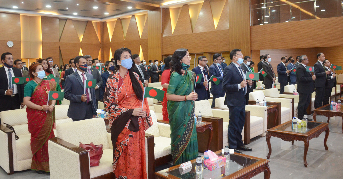বিজয়ের সুবর্ণজয়ন্তী ও মুজিববর্ষ উপলক্ষে দেশবাসীর সঙ্গে পররাষ্ট্র মন্ত্রণালয়ের কর্মকর্তারাও শপথ গ্রহণ করেছেন।