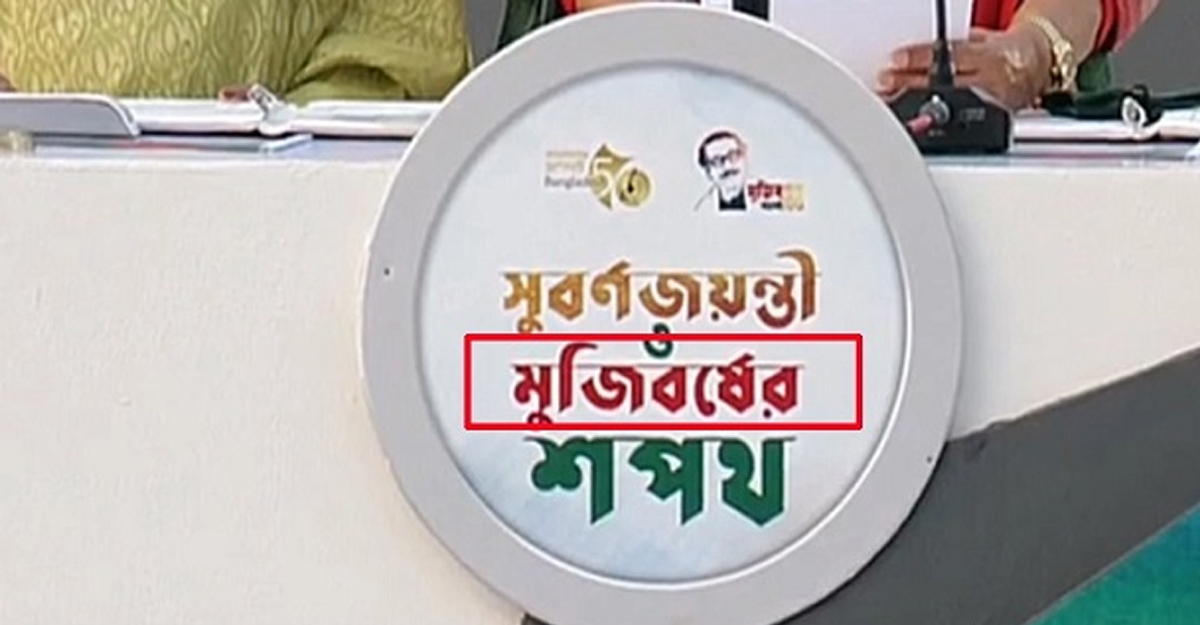 বিজয়ের ৫০ বছর পূর্তিতে সারা দেশের মানুষকে নিয়ে প্রধানমন্ত্রীর শপথ পাঠ অনুষ্ঠানের ডায়াসে ভুল বানান দেখা গেছে। বৃহস্পতিবার বিকেলে বিজয়ের সুবর্ণজয়ন্তী ও মুজিববর্ষ উপলক্ষে জাতীয় সংসদ ভবনের দক্ষিণ প্লাজায় এ শপথ অনুষ্ঠান হয়।