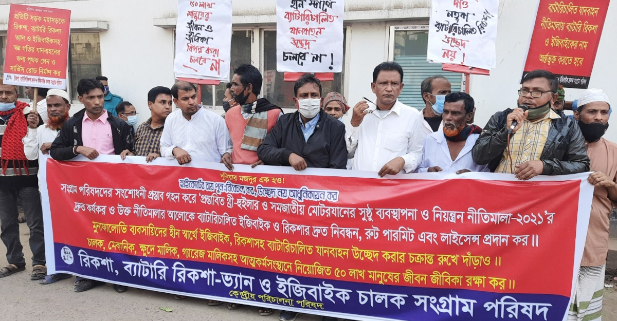 সমাবেশে সংগ্রাম পরিষদের আহ্বায়ক খালেকুজ্জামান লিপন বলেন, বিভিন্ন ব্যবসায়ী গোষ্ঠীর হীন স্বার্থে ইজিবাইক, রিকশাসহ ব্যাটারিচালিত যানবাহন উচ্ছেদের চক্রান্ত চলছে। এতে আমরা গভীর ক্ষোভ ও উদ্বেগ প্রকাশ করছি। এই খাতে চালক, মেকানিক, ক্ষুদে মালিক, গ্যারেজ মালিকসহ আত্মকর্মসংস্থানে নিয়োজিত ৫০ লাখ মানুষ রয়েছেন। তাদের ওপর নির্ভরশীল আড়াই কোটি মানুষ। তাই এই আড়াই কোটি মানুষের জীবন জীবিকা রক্ষায় হাইকোর্টর দেওয়া রুল পুনর্বিবেচনার জন্য আদালতের প্রতি অনুরোধ জানাচ্ছি।