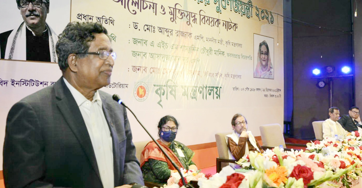 বুধবার (২২ ডিসেম্বর) বিকেলে ঢাকায় কৃষিবিদ ইনস্টিটিউশন বাংলাদেশ মিলনায়তনে মুজিব শতবর্ষে বিজয়ের সুবর্ণজয়ন্তী উপলক্ষে কৃষি মন্ত্রণালয় আয়োজিত এক আলোচনা সভা ও নাট্যানুষ্ঠানে মন্ত্রী এসব কথা বলেন।