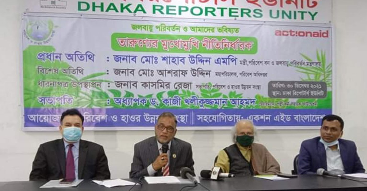 সভাপতি অধ্যাপক কাজী খলিকুজ্জমান আহমদ বলেন, পরিবেশ জলবায়ুর চেয়ে ব্যাপক বিষয়। জলবায়ু পরিবর্তনের প্রভাব মোকাবিলায় সরকার আন্তর্জাতিক সম্প্রদায়ের ওপর নানাভাবে চাপ সৃষ্টি করে যাচ্ছে। তরুণদেরও এ ব্যাপারে সোচ্চার হতে হবে।