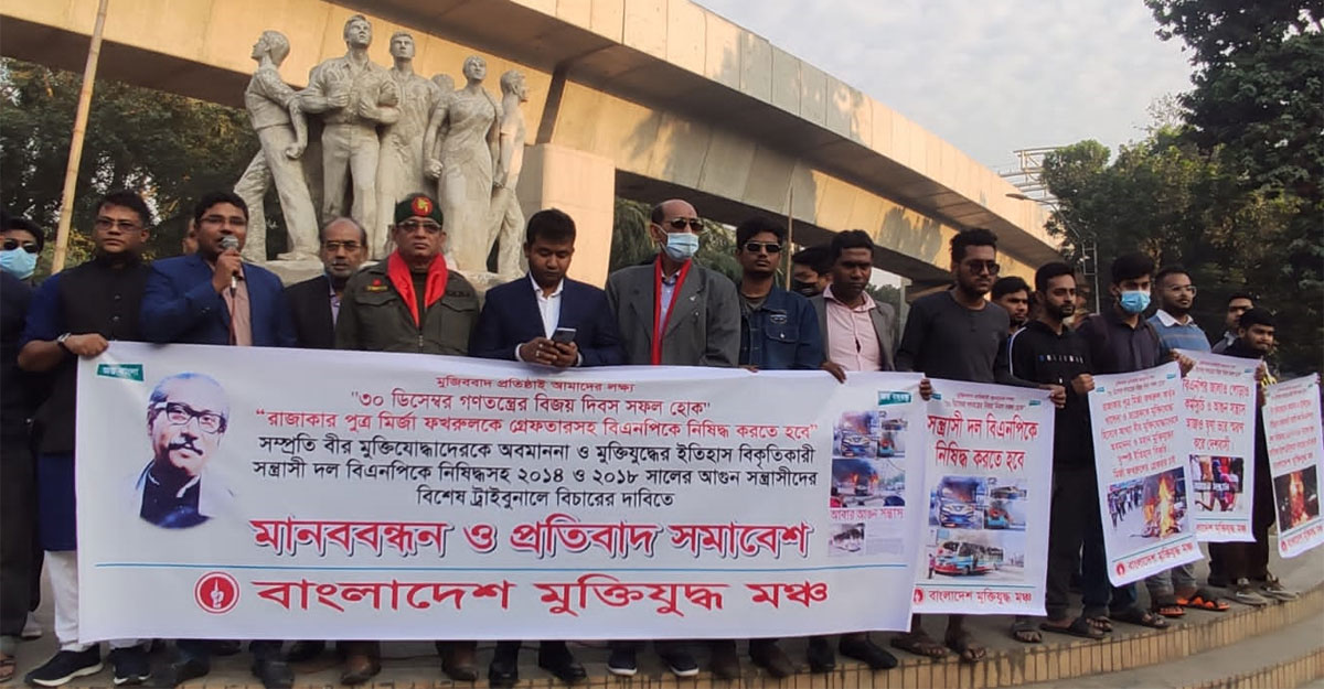 সম্প্রতি বীর মুক্তিযোদ্ধাদেরকে অবমাননা ও মুক্তিযুদ্ধের ইতিহাস বিকৃতির অভিযোগে মির্জা ফখরুল ইসলাম আলমগীরকে গ্রেফতার ও আগুনে পুড়িয়ে মানুষ হত্যার অপরাধে বিএনপিকে নিষিদ্ধের দাবিতে মানববন্ধন ও প্রতিবাদ সমাবেশ করেছে বাংলাদেশ মুক্তিযুদ্ধ মঞ্চ।