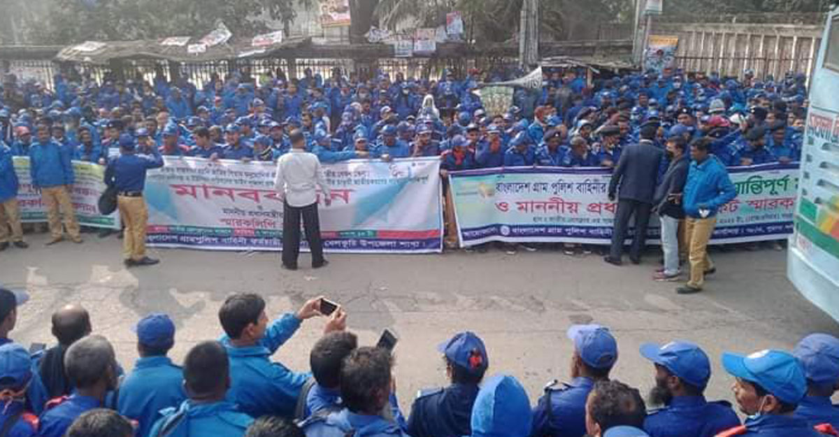 গ্রাম পুলিশের চাকরি জাতীয়করণের দাবিতে প্রধানমন্ত্রী বরাবর স্মারকলিপি পেশ কর্মসূচিতে বাধা দিয়েছে পুলিশ।