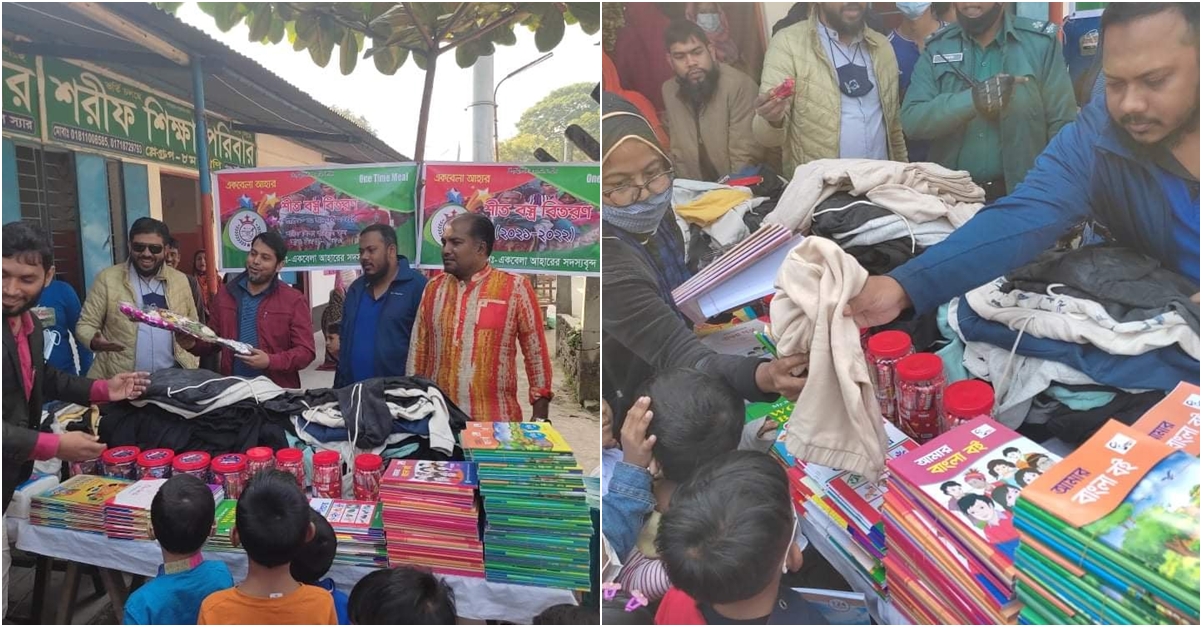 রাজধানীর মীরপুরে শরীফ শিক্ষা পরিবার স্কুলের শিক্ষার্থীদের মাঝে শীতবস্ত্র বিতরণ করেছে ‘এক বেলা আহার’ সংগঠন।