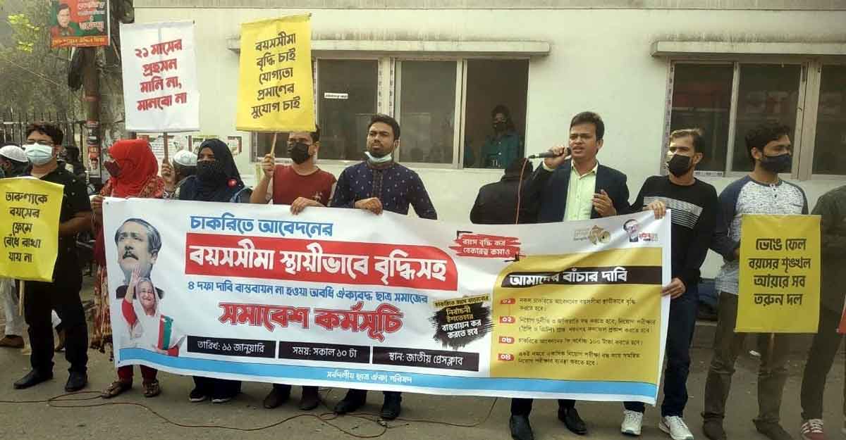 সব চাকরিতে প্রবেশের বয়সসীমা স্থায়ীভাবে বৃদ্ধি এবং নিয়োগ পরীক্ষায় জালিয়াতি বন্ধ ও নিয়োগ পরীক্ষার (প্রিলি ও রিটেন) মার্কসহ ফল প্রকাশসহ ৪ দফা দাবি জানিয়েছে সর্বদলীয় চাকরি প্রত্যাশী ঐক্য পরিষদের।