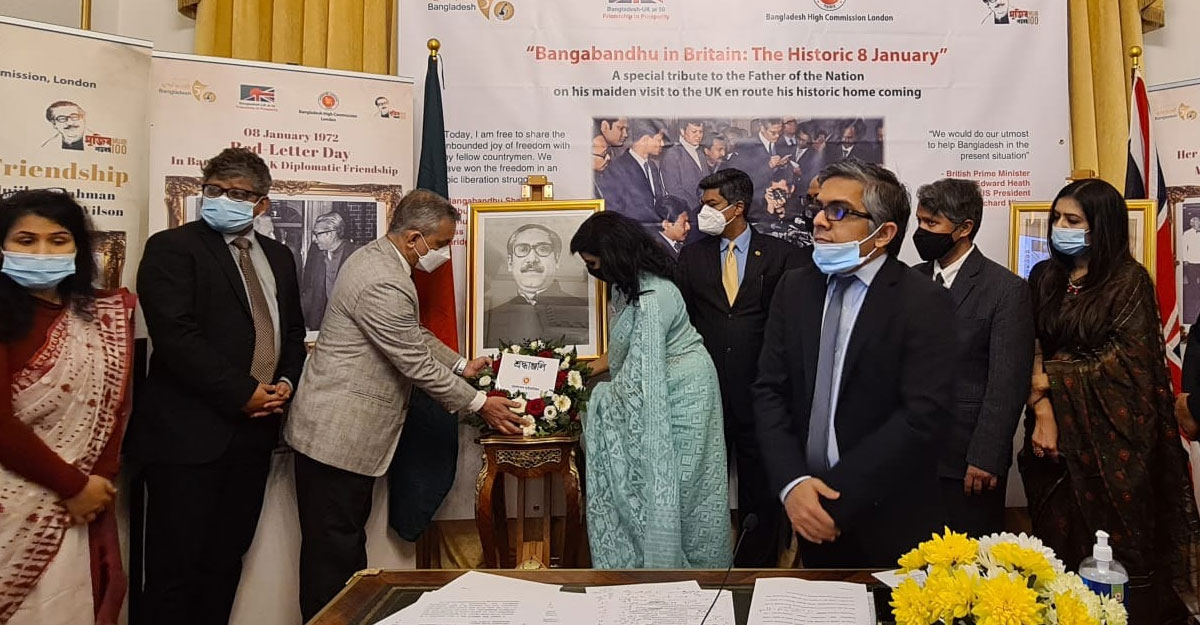 অনুষ্ঠানের শুরুতে হাইকমিশনার মিশনের কর্মকর্তাদের নিয়ে বঙ্গবন্ধুর প্রতিকৃতিতে পুষ্পস্তবক অর্পণ করেন। বঙ্গবন্ধুর ঐতিহাসিক ৮ জানুয়ারি সফরের ওপর লন্ডন মিশন কর্তৃক নির্মিত একটি তথ্যচিত্র দেখানো হয়।