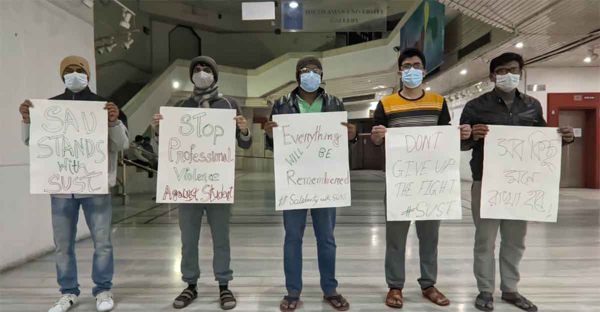 সংহতি কর্মসূচিতে অংশ নিয়ে শিক্ষার্থীরা বলেন, বাংলাদেশের সিলেটে শাহজালাল বিজ্ঞান ও প্রযুক্তি বিশ্ববিদ্যালয়ে শিক্ষার্থীদের যৌক্তিক দাবি মেনে না দিয়ে বিশ্ববিদ্যালয় প্রশাসন যেভাবে ক্ষমতাসীন ছাত্র সংগঠন ও পুলিশ দিয়ে শিক্ষার্থীদের উপর হামলা করেছে তা নিন্দনীয়। পুলিশ দিয়ে এই উপমহাদেশের কোনো ছাত্র আন্দোলনকে বন্ধ করা যায়নি।