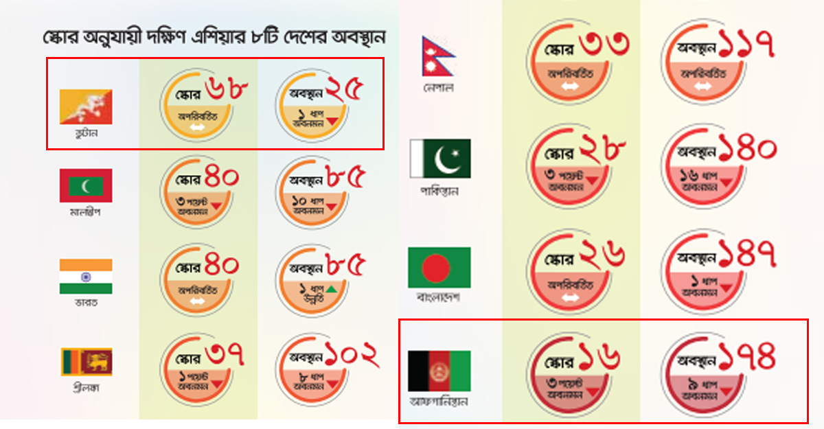 আর দক্ষিণ এশিয়ার দেশগুলোর মধ্যে কম দুর্নীতিগ্রস্ত দেশগুলোর তালিকায় সবার ওপরে ভুটান। দেশটির স্কোর ৬৮। কম দুর্নীতিগ্রস্ত হিসেবে বিশ্বের মধ্যে ২৫তম স্থান পেয়েছে দেশটি।