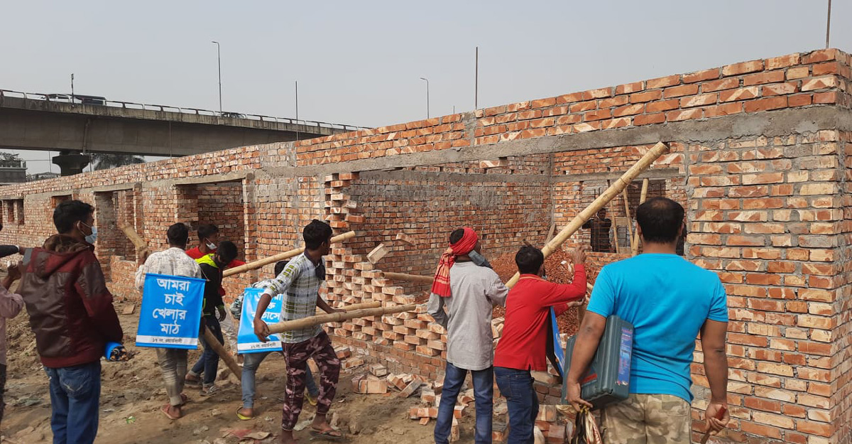 রেলমন্ত্রী এবং রেলের ডিজির সঙ্গে মেয়রের এ কথোপকথন স্থানীয়রাও শুনছিলেন। ‘জলাধার দখল করে আমি কোনোভাবেই এটা এখানে হতে দেব না’— মেয়রের এ কথা শোনামাত্রই স্থানীয়রা সেখানে গড়ে ওঠা স্থাপনা ভাঙতে শুরু করেন। মুহূর্তেই অস্থায়ী স্থাপনার বেশকিছু অংশ ভেঙে ফেলেন তারা। আগে থেকেই তারা সেখানে স্লোগান দিচ্ছিলেন— ‘আমরা এখানে মাঠ চাই, পার্ক চাই, জলাধার নষ্ট হতে দেব না।’