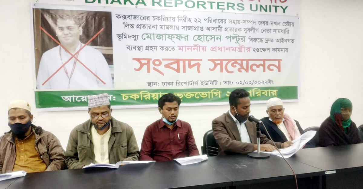 বুধবার (২ ফেব্রুয়ারি) ঢাকা রিপোর্টার্স ইউনিটির নসরুল হামিদ মিলনায়তনে আয়োজিত এক সংবাদ সম্মেলনে এ অভিযোগ করেন ভুক্তভোগী পরিবারগুলো। যেকোনো মুহূর্তে ওই যুবলীগ নেতা পল্টুর নেতৃত্বে জবরদখলসহ হামলার শিকার হওয়ার আশঙ্কাও করছেন তারা। পরিবারগুলোর পক্ষে সংবাদ সম্মেলনে লিখিত বক্তব্য পাঠ করেন চকরিয়া পৌরসভা আওয়ামী লীগের ৩নং ওয়ার্ড শাখার সাধারণ সম্পাদক সফুর আলম।
