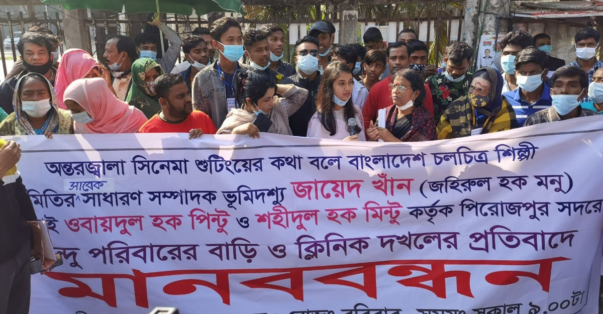 মানববন্ধনে লিখিত বক্তব্যে গীতা রানী বলেন, আমার স্বামী ডা. বিজয় কৃষ্ণ হাওলাদার পিরোজপুর জেলা সদরের মাছিমপুর বাইপাস সড়কের পাশে তার সারা জীবনের উপার্জিত অর্থ ও পরিশ্রম দ্বারা ৪০ শয্যা বিশিষ্ট সার্জিকেয়ার ক্লিনিক অ্যান্ড ডায়াগনস্টিক সেন্টার প্রতিষ্ঠা করে পরিচালনা করে আসছে। কিন্তু ভূমি দস্যু সন্ত্রাসী ও নারী নির্যাতনকারী জাতীয় পার্টির সাবেক নেতা ওবায়দুল হক পিন্টু, বাংলাদেশ চলচ্চিত্র শিল্পী সমিতির সাধারণ সম্পাদক জহিরুল হক মনু ওরফে জায়েদ খান ও শহীদুল হক মিন্টু ২০১৬ সালের ২১ মার্চ রাত আনুমানিক ২টার সময় আমাদের ভবনের ৫ম তলায় আমরা যেখানে থাকি, সেখানে অন্তরজ্বালা সিনেমা শুটিংয়ের কথা বলে জায়েদ খান ও তার ভাইয়েরা তাদের অস্ত্রধারী সন্ত্রাসী বাহিনী আমাদের বিভিন্ন কক্ষে অনধিকার প্রবেশ করে। সেখানে আমাদের সবাইকে অস্ত্রের মুখে জিম্মি করে বিভিন্ন কক্ষে ঢুকে যাবতীয় অর্থ সম্পদ লুটপাট করে।