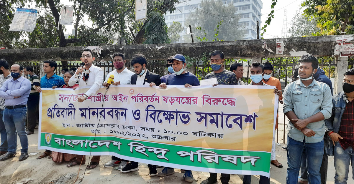 সনাতন শাস্ত্রীয় আইন পরিবর্তনের ‘ষড়যন্ত্রের’ বিরুদ্ধে মানববন্ধন ও বিক্ষোভ সমাবেশ করেছে বাংলাদেশ হিন্দু পরিষদ নামক একটি সংগঠন। শুক্রবার (১৮ ফেব্রুয়ারি) জাতীয় প্রেস ক্লাবের সামনে আয়োজিত এ মানববন্ধন ও বিক্ষোভ সমাবেশ অনুষ্ঠিত হয়।