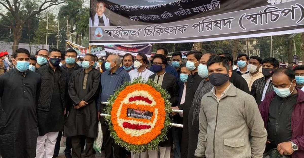 অমর একুশে ফেব্রুয়ারি মহান শহীদ দিবস ও আন্তর্জাতিক মাতৃভাষা দিবসে ভাষা শহীদদের প্রতি শ্রদ্ধা নিবেদন করেছে বাংলাদেশ আওয়ামী লীগের সহযোগী সংগঠন স্বাধীনতা চিকিৎসক পরিষদের (স্বাচিপ) কেন্দ্রীয় কমিটি।