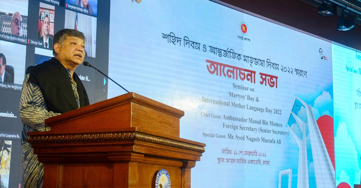 পররাষ্ট্র সচিব মাসুদ বিন মোমেন বলেছেন, ১৯৫২’র ভাষা আন্দোলনে শহীদদের আত্মত্যাগের মাধ্যমেই আজ বিশ্বব্যাপী মাতৃভাষার মর্যাদা ও অধিকার প্রতিষ্ঠিত হয়েছে।