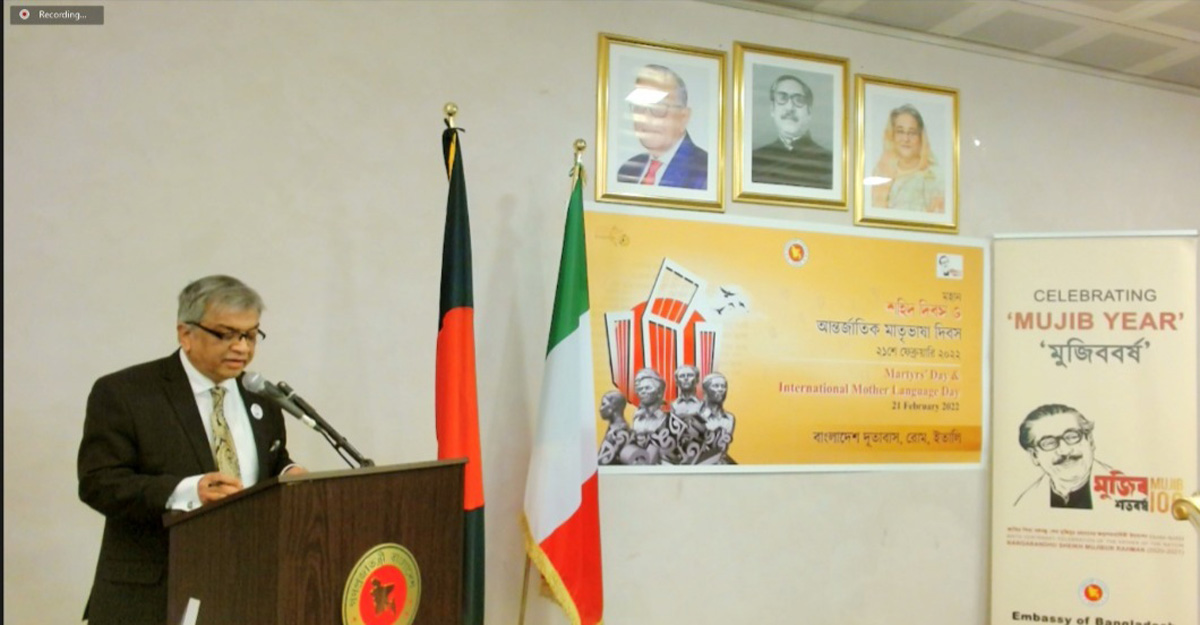 ইতালির রোমে অবস্থিত বাংলাদেশ দূতাবাস যথাযথ মর্যাদায় শহীদ দিবস ও আন্তর্জাতিক মাতৃভাষা দিবস পালন করেছে। সোমবার (২১ ফেব্রুয়ারি) দিবসের বিশেষ কর্মসূচির অংশ হিসেবে সকালে দূতাবাস প্রাঙ্গণে আনুষ্ঠানিকভাবে জাতীয় পতাকা অর্ধনমিত করা হয় এবং চ্যান্সেরী প্রাঙ্গণে স্থাপিত শহীদ মিনারে রাষ্ট্রদূতের নেতৃত্বে দূতাবাসের সব কর্মকর্তা-কর্মচারী পুষ্পস্তবক অর্পণ করেন।